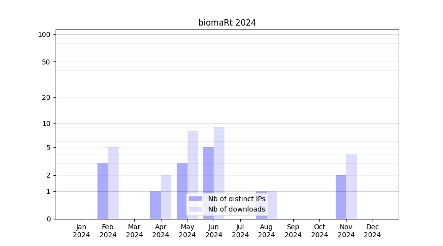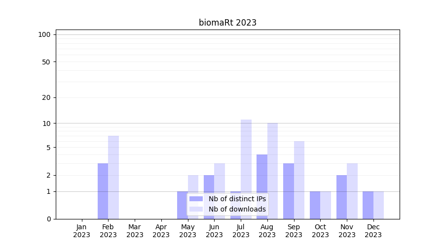 Number of downloads for workflow package biomaRt, year by year, from 2025 back to 2015 (years with no downloads are omitted):