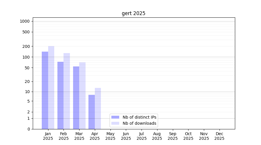 Number of downloads for workflow package gert, year by year, from 2025 back to 2015 (years with no downloads are omitted):