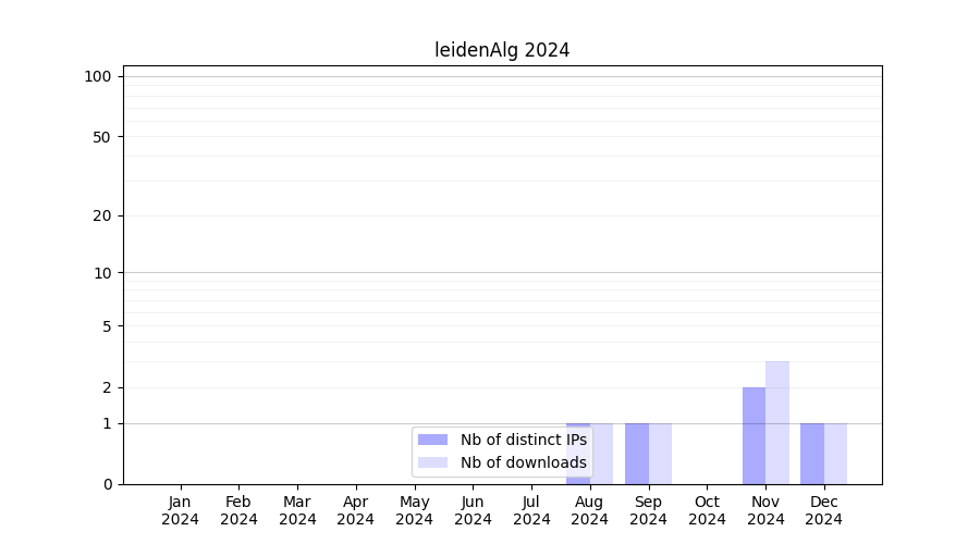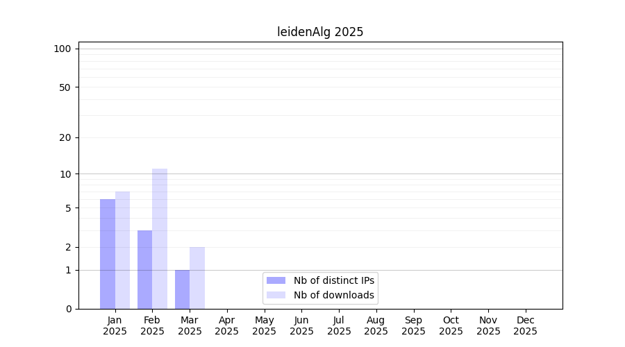Number of downloads for workflow package leidenAlg, year by year, from 2025 back to 2015 (years with no downloads are omitted):