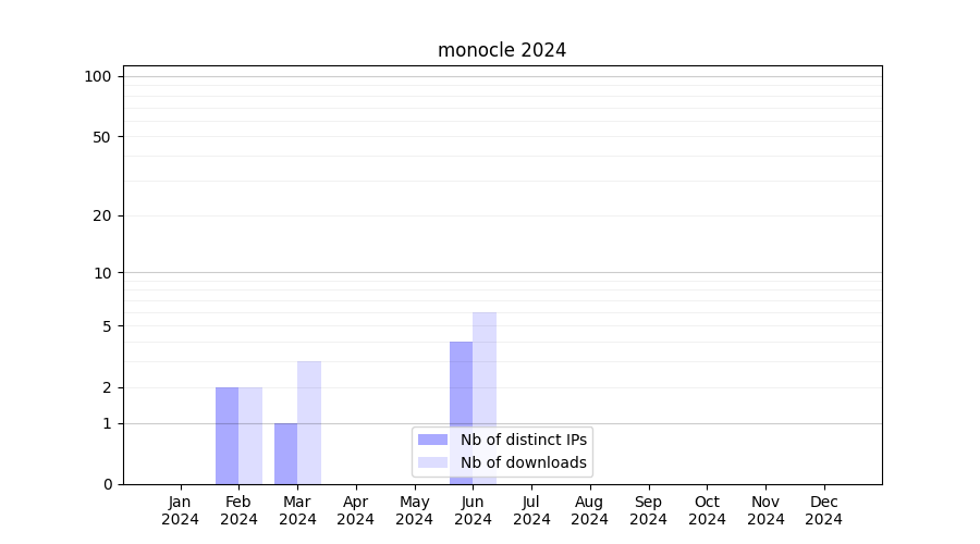 Number of downloads for workflow package monocle, year by year, from 2025 back to 2015 (years with no downloads are omitted):