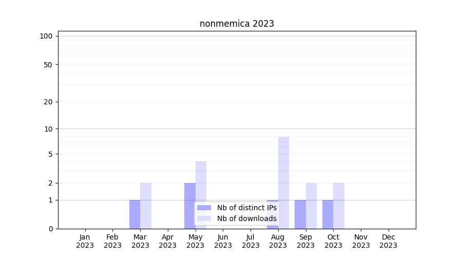 Number of downloads for workflow package nonmemica, year by year, from 2025 back to 2015 (years with no downloads are omitted):