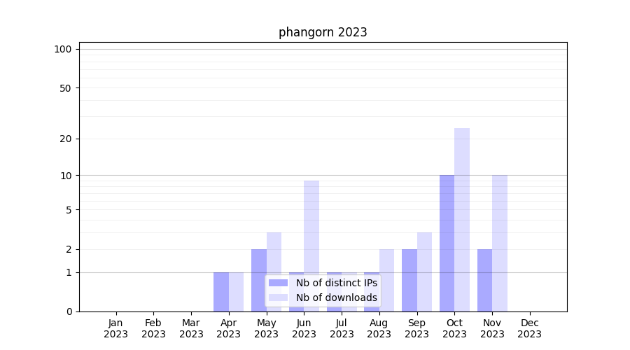 Number of downloads for workflow package phangorn, year by year, from 2025 back to 2015 (years with no downloads are omitted):