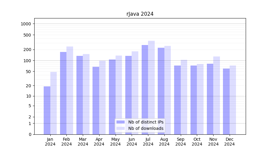 Number of downloads for workflow package rJava, year by year, from 2025 back to 2015 (years with no downloads are omitted):