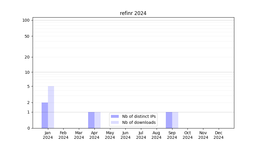 Number of downloads for workflow package refinr, year by year, from 2025 back to 2015 (years with no downloads are omitted):