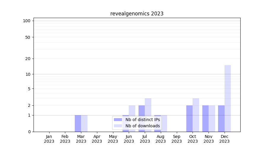 Number of downloads for workflow package revealgenomics, year by year, from 2025 back to 2015 (years with no downloads are omitted):