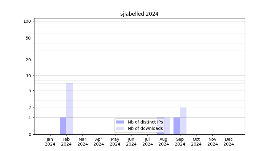 Number of downloads for workflow package sjlabelled, year by year, from 2025 back to 2015 (years with no downloads are omitted):