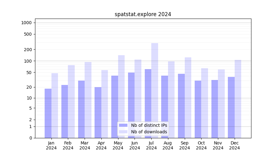 Number of downloads for workflow package spatstat.explore, year by year, from 2025 back to 2015 (years with no downloads are omitted):
