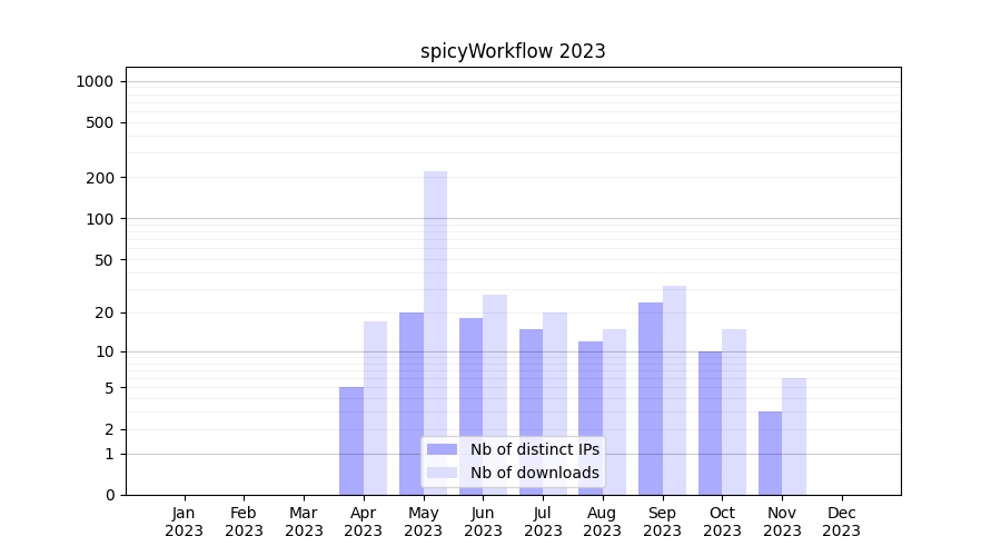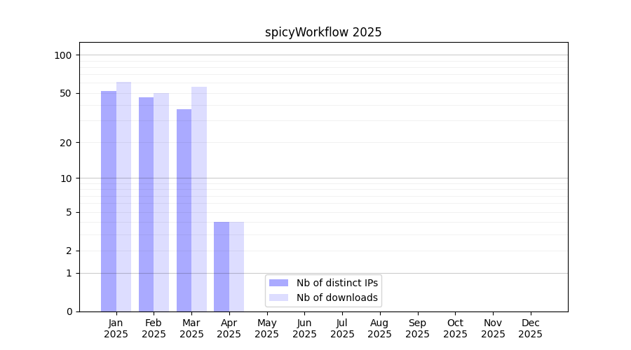 Number of downloads for workflow package spicyWorkflow, year by year, from 2025 back to 2015 (years with no downloads are omitted):