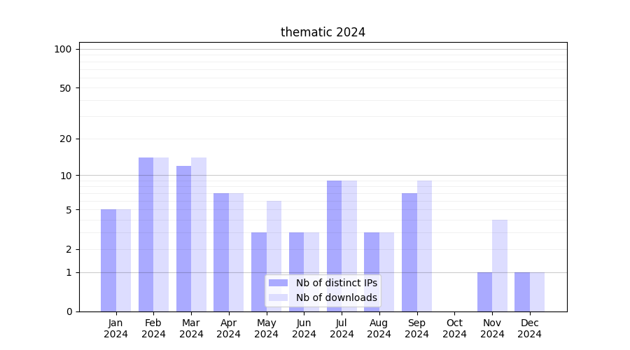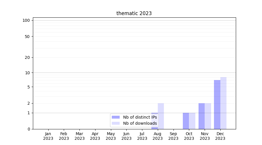 Number of downloads for workflow package thematic, year by year, from 2025 back to 2015 (years with no downloads are omitted):