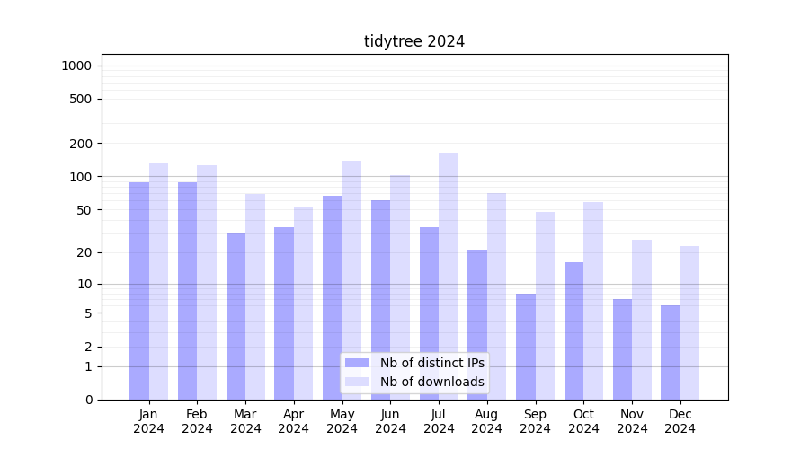 Number of downloads for workflow package tidytree, year by year, from 2025 back to 2015 (years with no downloads are omitted):