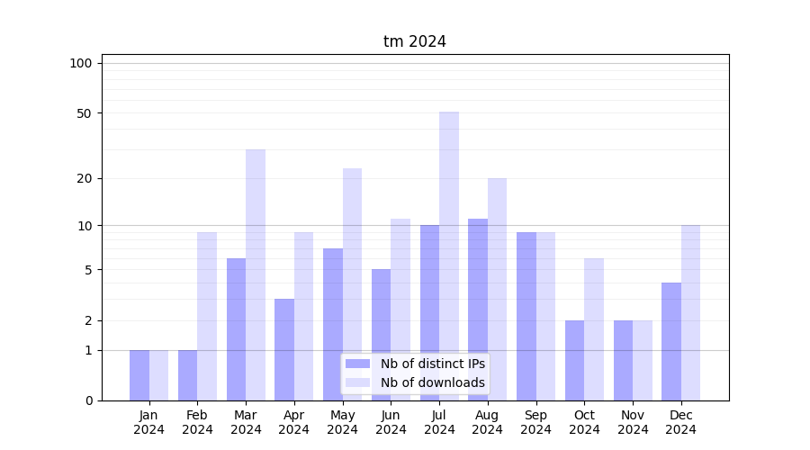 Number of downloads for workflow package tm, year by year, from 2025 back to 2015 (years with no downloads are omitted):