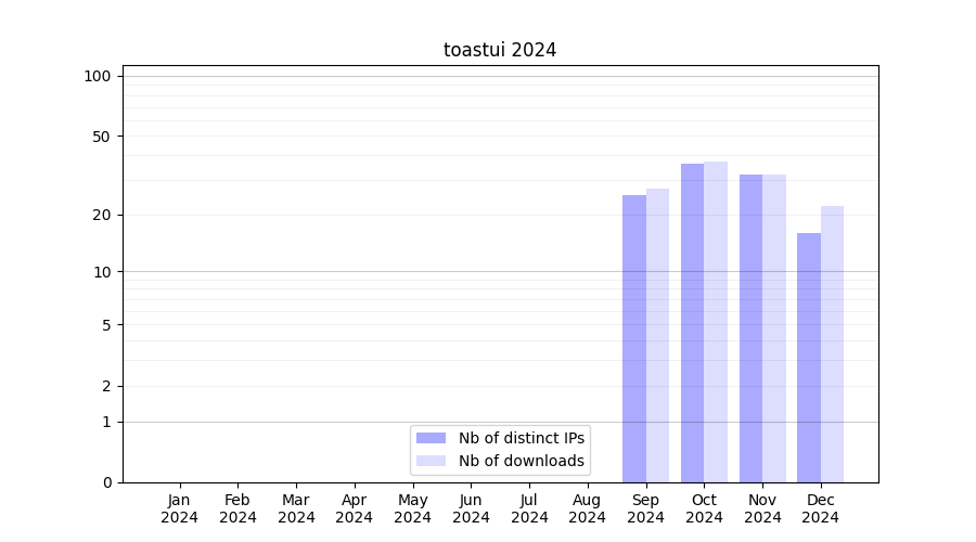 Number of downloads for workflow package toastui, year by year, from 2025 back to 2015 (years with no downloads are omitted):