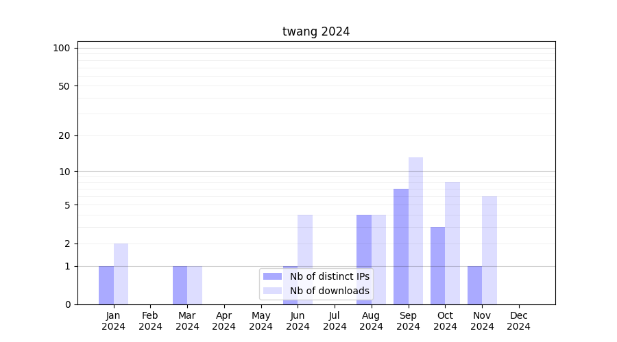Number of downloads for workflow package twang, year by year, from 2025 back to 2015 (years with no downloads are omitted):