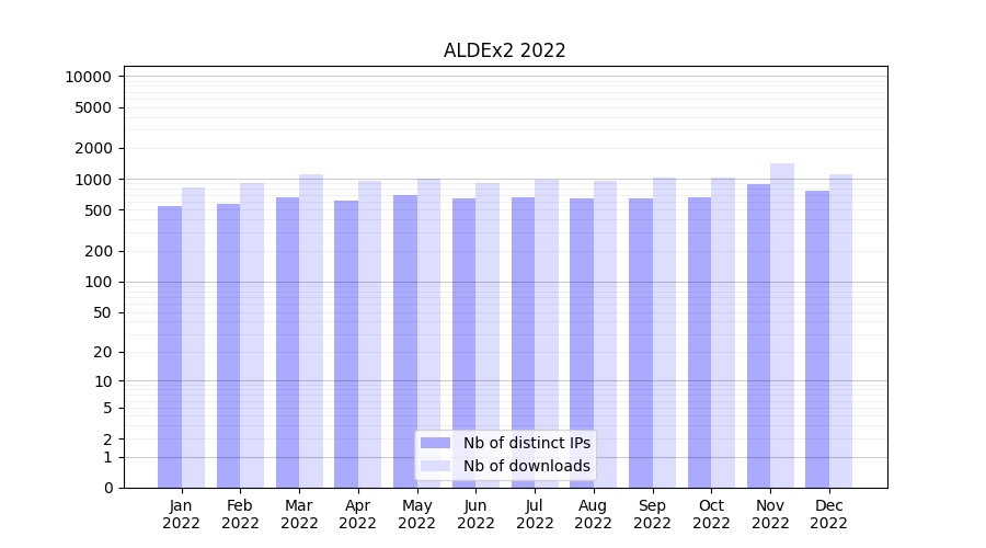 Number of downloads for software package ALDEx2, year by year, from 2025 back to 2014 (years with no downloads are omitted):