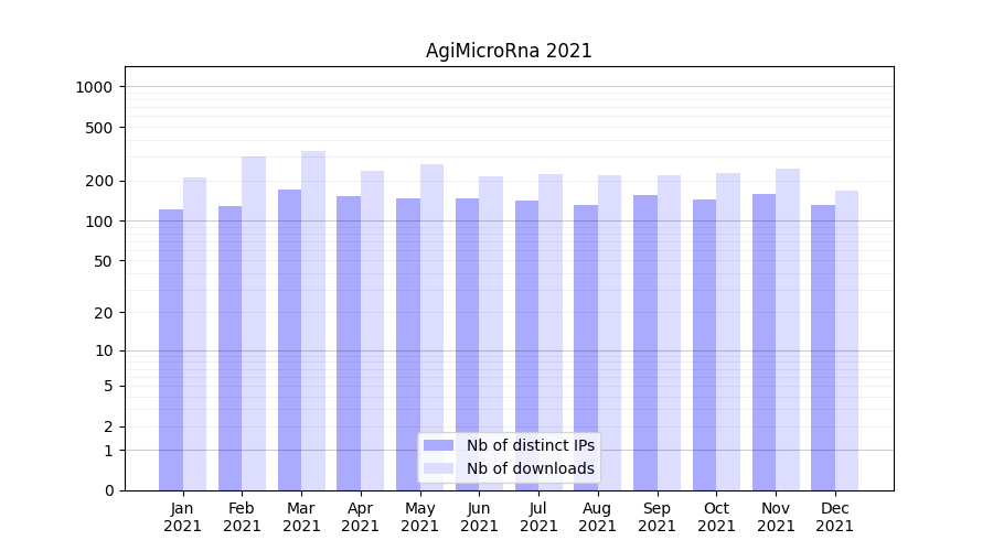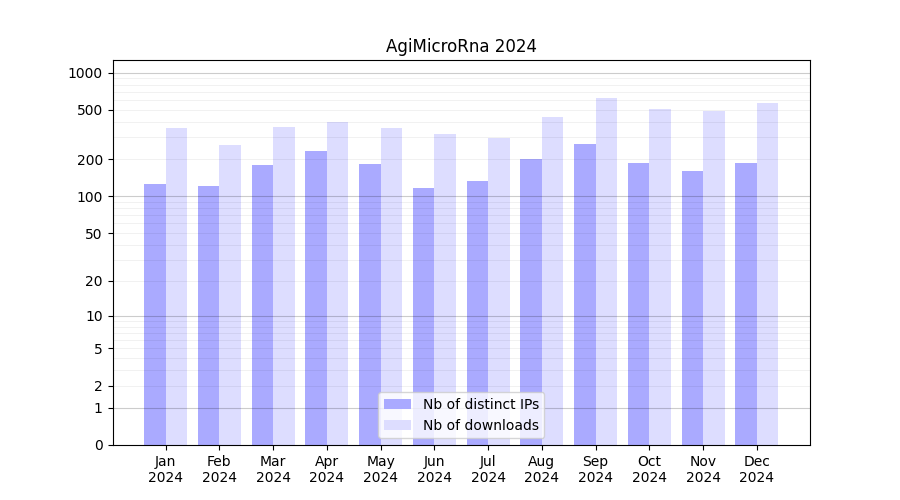 Number of downloads for software package AgiMicroRna, year by year, from 2025 back to 2014 (years with no downloads are omitted):