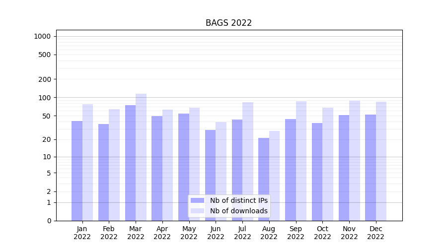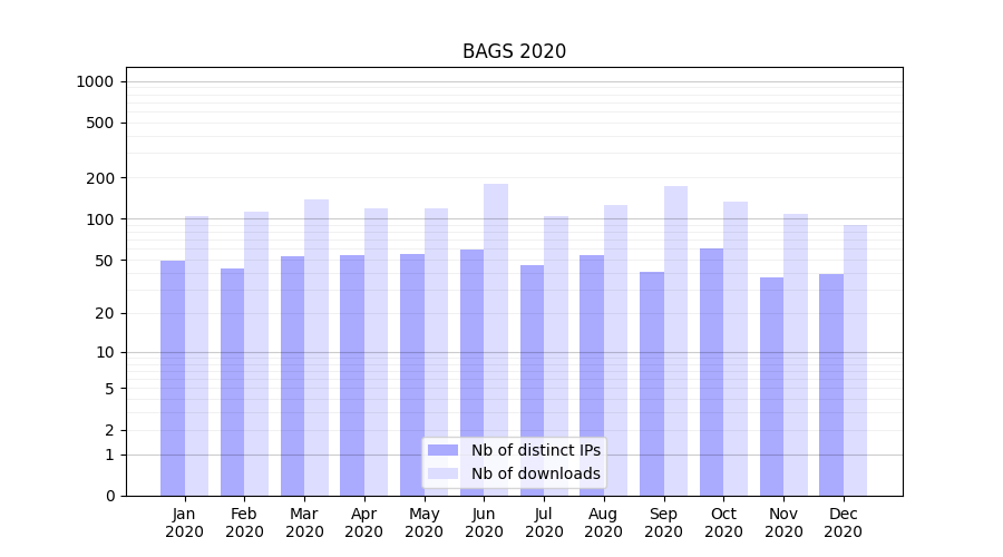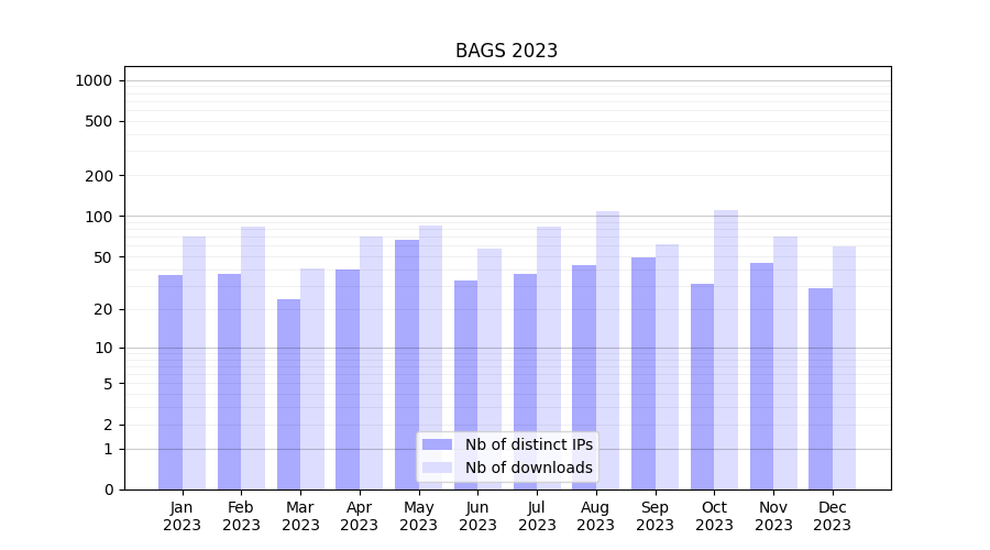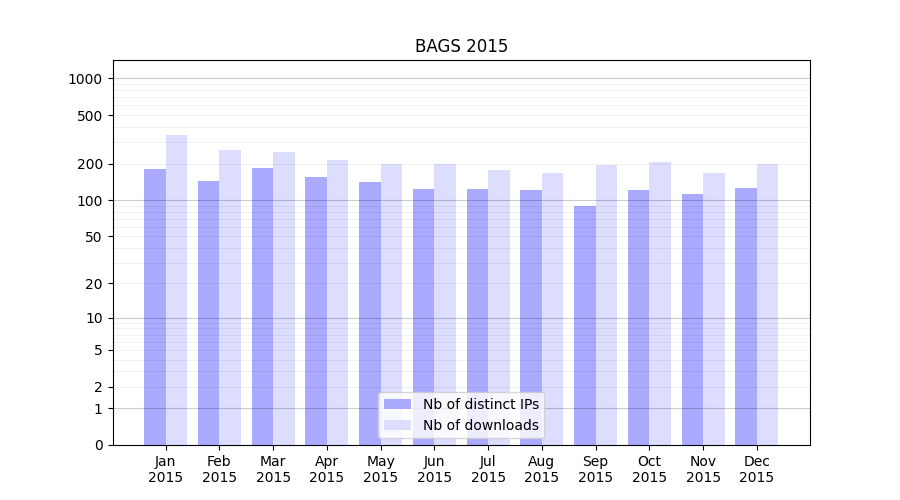 Number of downloads for software package BAGS, year by year, from 2025 back to 2014 (years with no downloads are omitted):