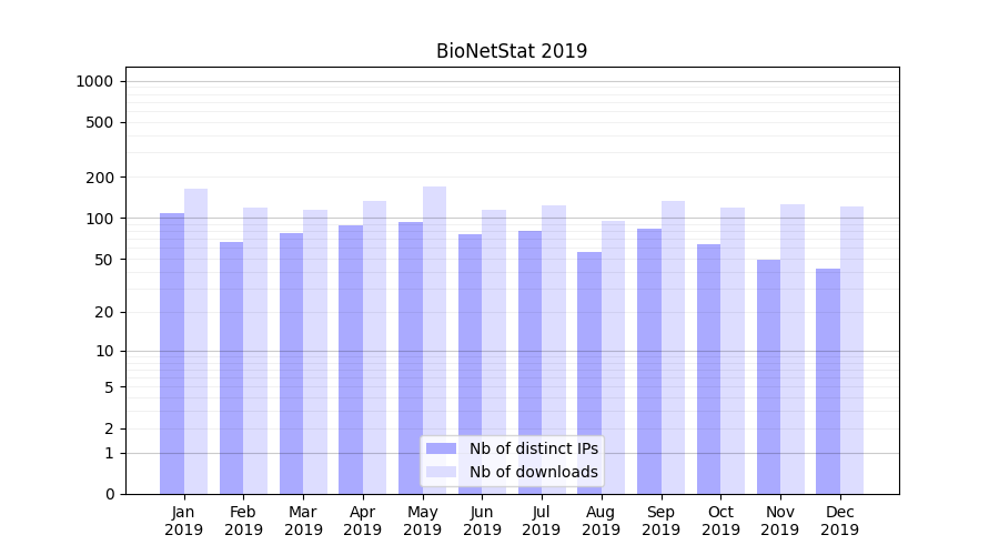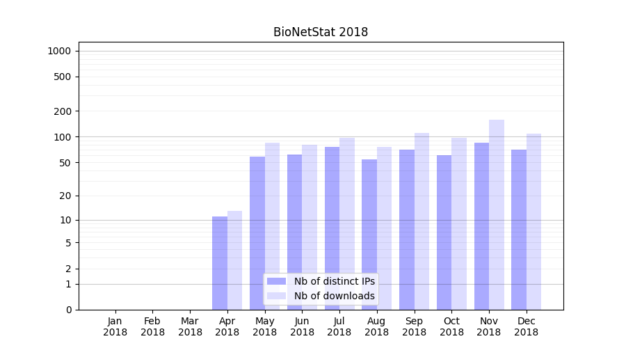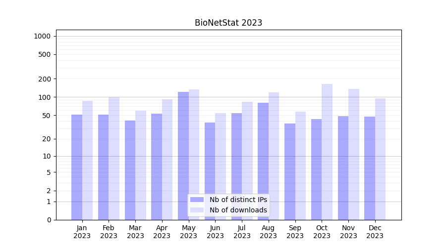 Number of downloads for software package BioNetStat, year by year, from 2025 back to 2014 (years with no downloads are omitted):