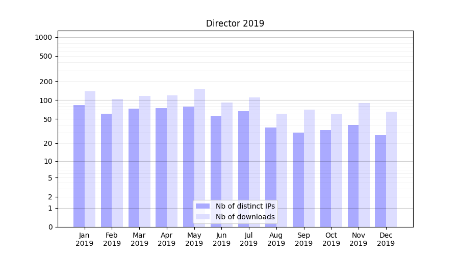 Number of downloads for software package Director, year by year, from 2025 back to 2014 (years with no downloads are omitted):