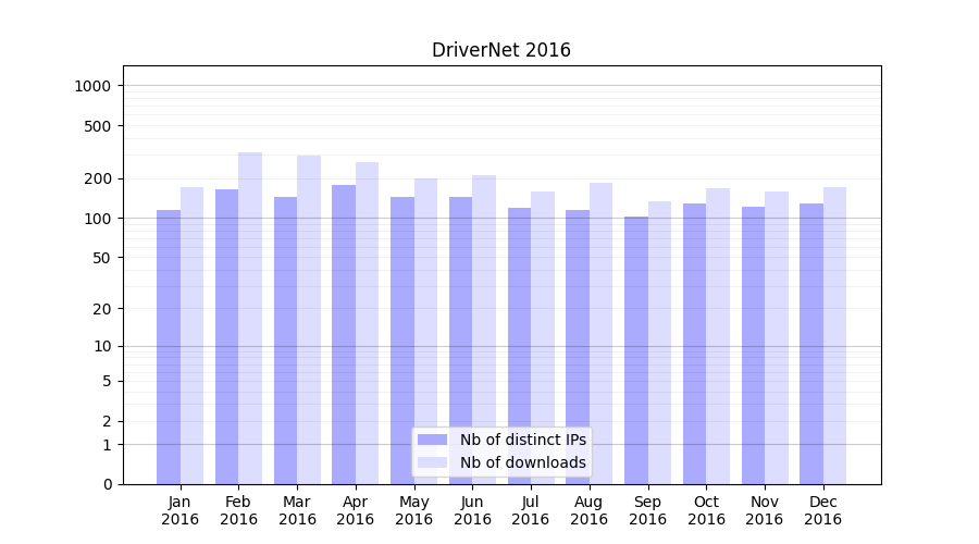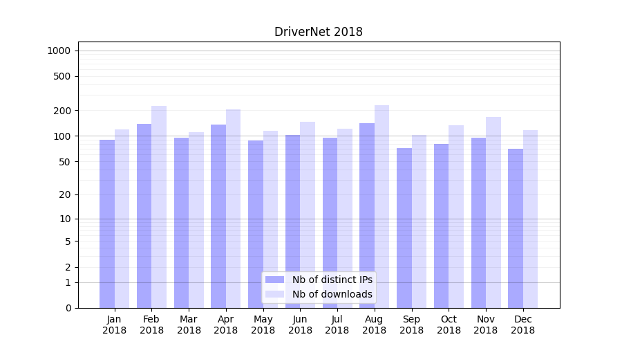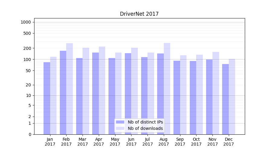 Number of downloads for software package DriverNet, year by year, from 2025 back to 2014 (years with no downloads are omitted):