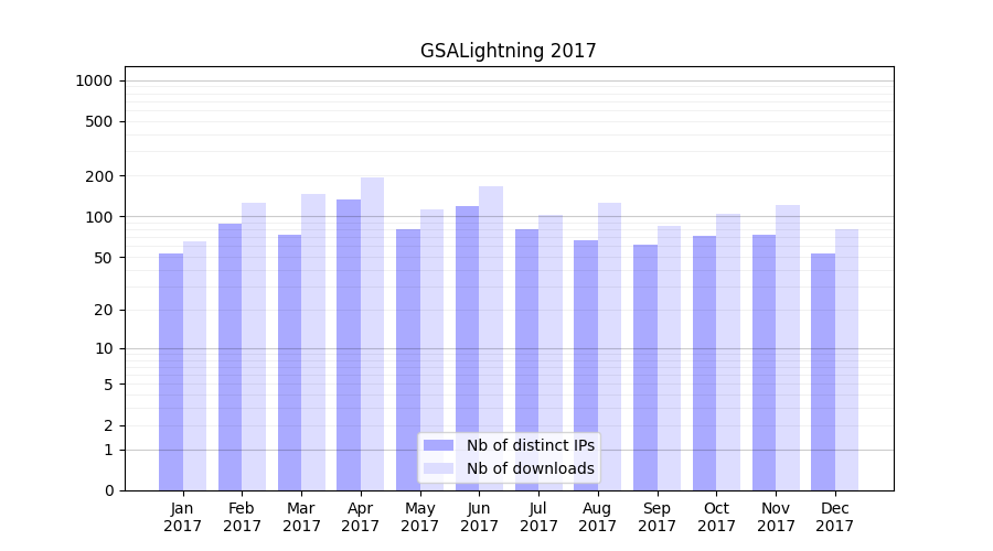 Number of downloads for software package GSALightning, year by year, from 2025 back to 2014 (years with no downloads are omitted):