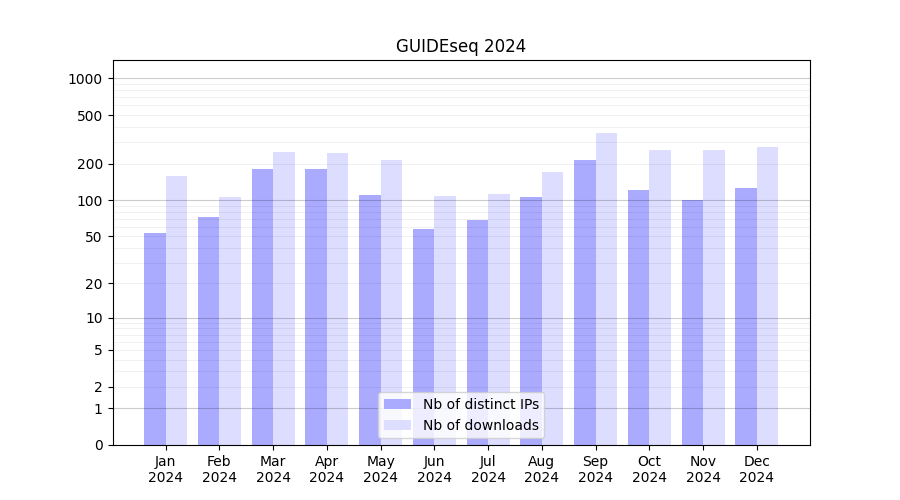 Number of downloads for software package GUIDEseq, year by year, from 2025 back to 2014 (years with no downloads are omitted):