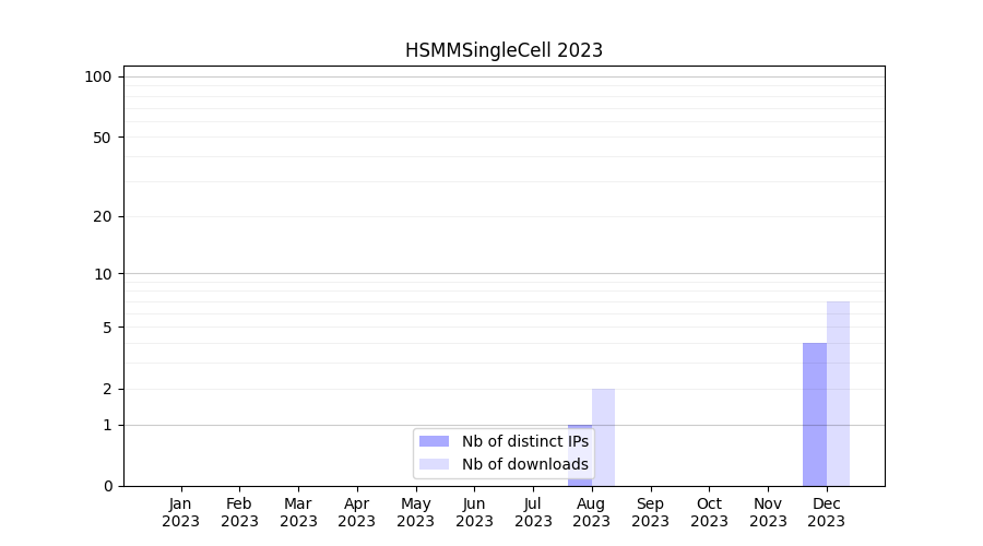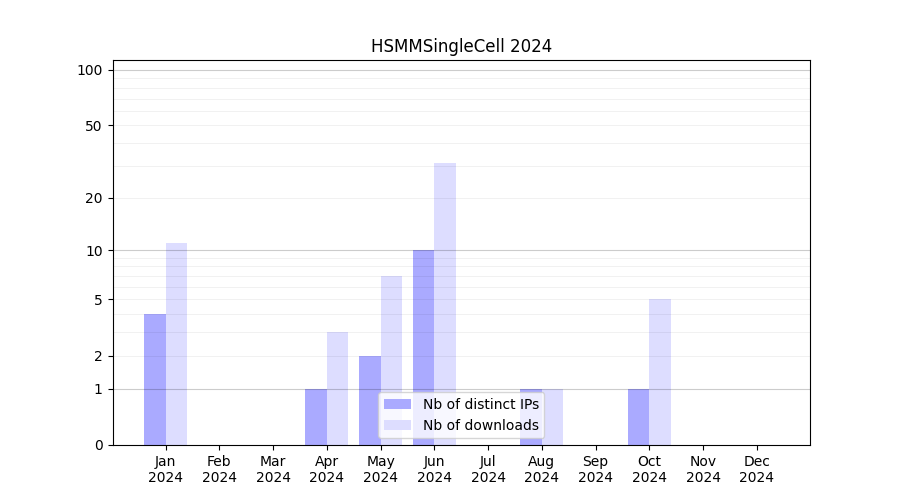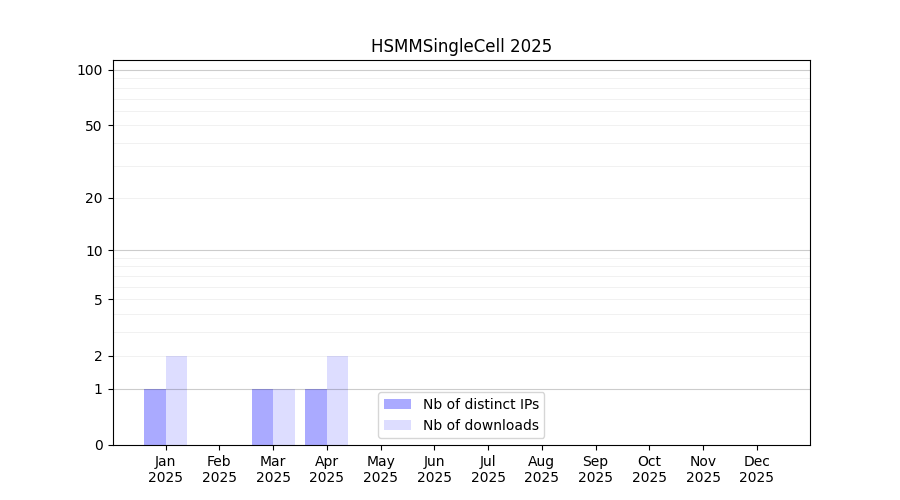 Number of downloads for software package HSMMSingleCell, year by year, from 2025 back to 2014 (years with no downloads are omitted):