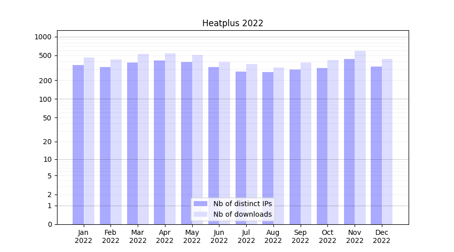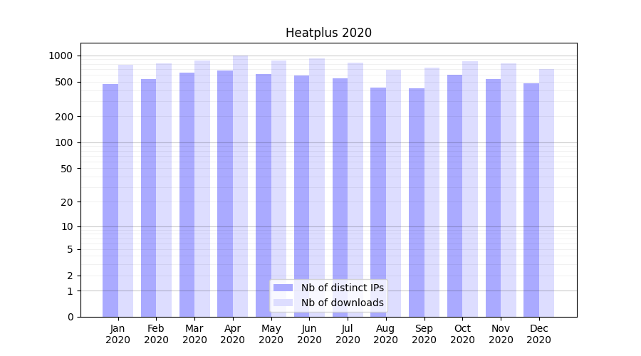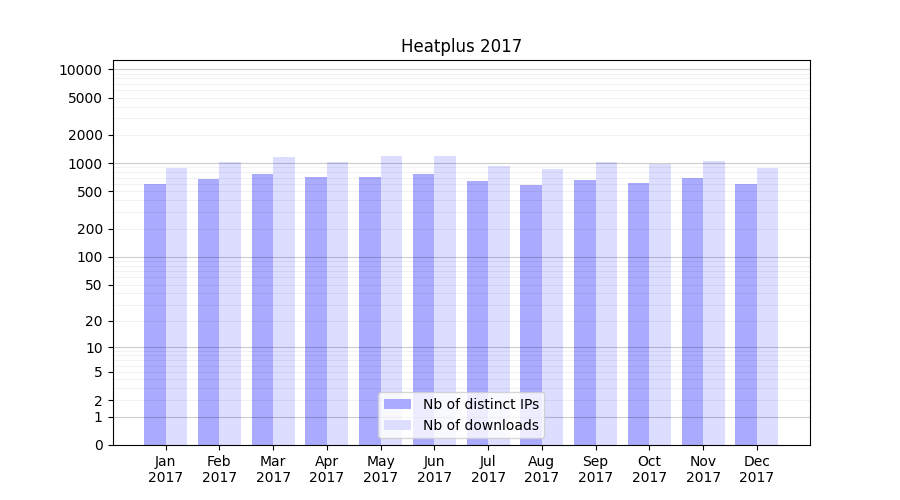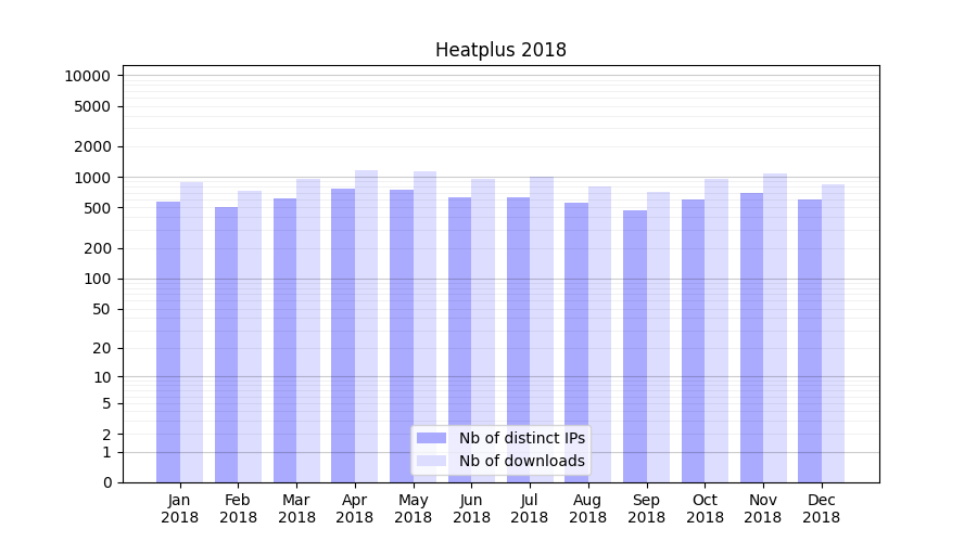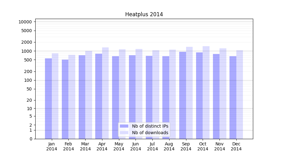 Number of downloads for software package Heatplus, year by year, from 2025 back to 2014 (years with no downloads are omitted):