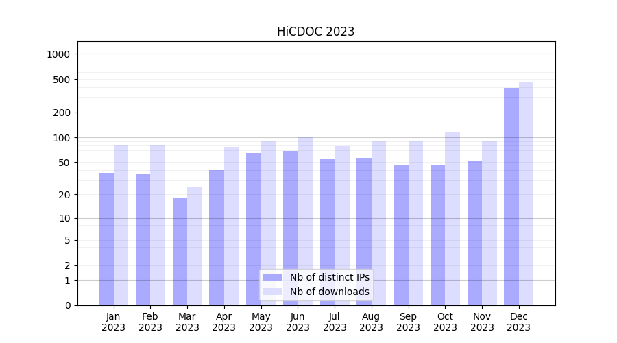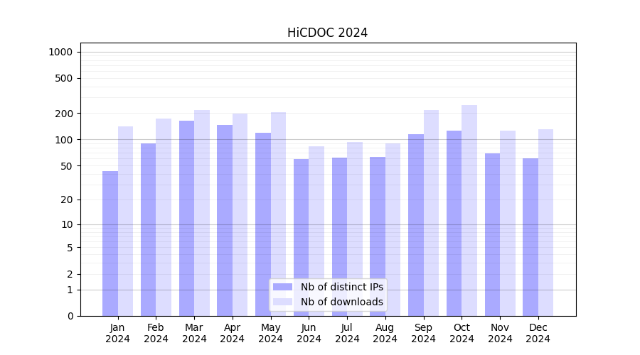 Number of downloads for software package HiCDOC, year by year, from 2025 back to 2014 (years with no downloads are omitted):