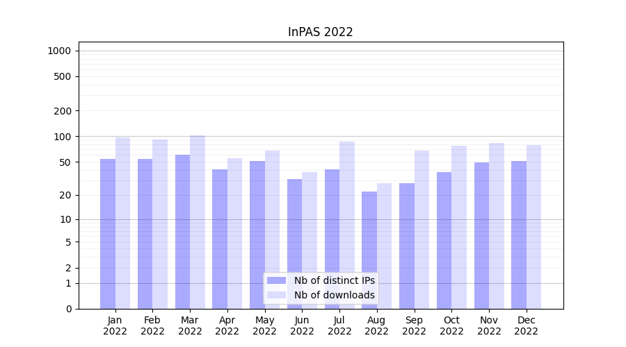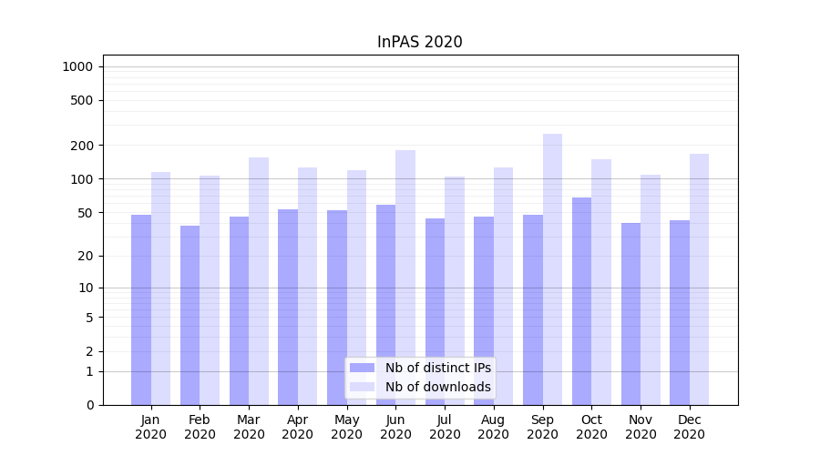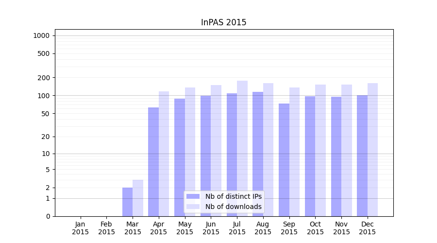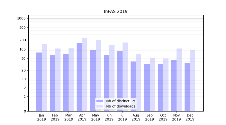 Number of downloads for software package InPAS, year by year, from 2025 back to 2014 (years with no downloads are omitted):