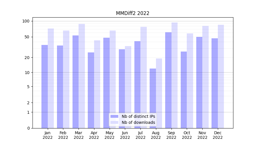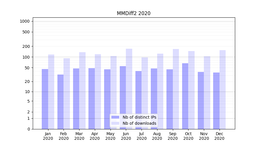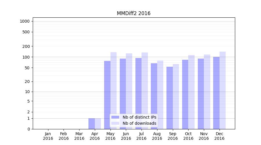 Number of downloads for software package MMDiff2, year by year, from 2025 back to 2014 (years with no downloads are omitted):