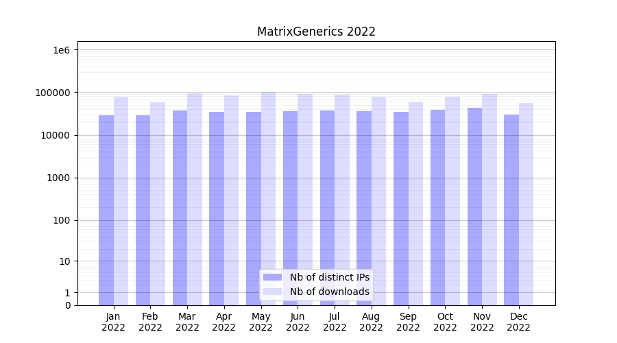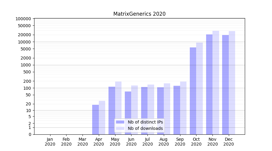 Number of downloads for software package MatrixGenerics, year by year, from 2025 back to 2014 (years with no downloads are omitted):