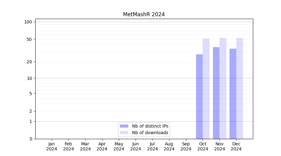 Number of downloads for software package MetMashR, year by year, from 2025 back to 2014 (years with no downloads are omitted):
