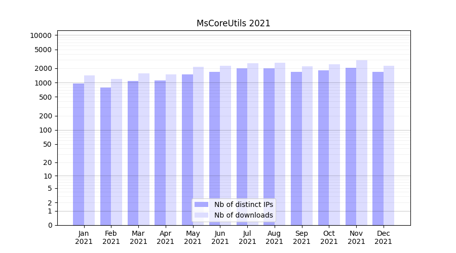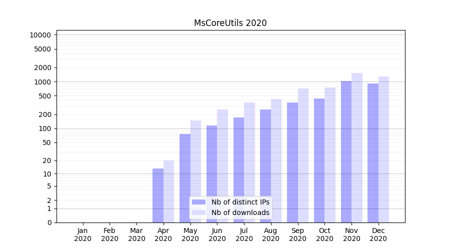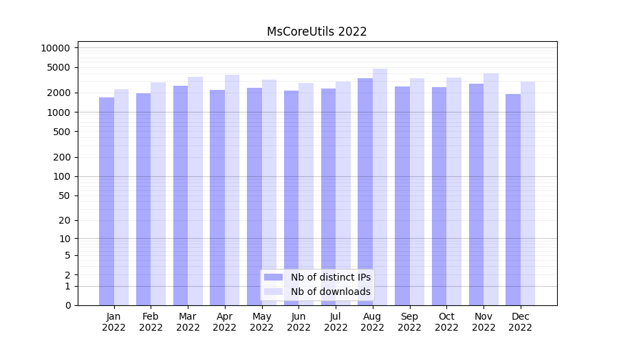 Number of downloads for software package MsCoreUtils, year by year, from 2025 back to 2014 (years with no downloads are omitted):