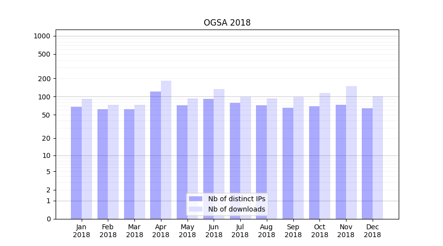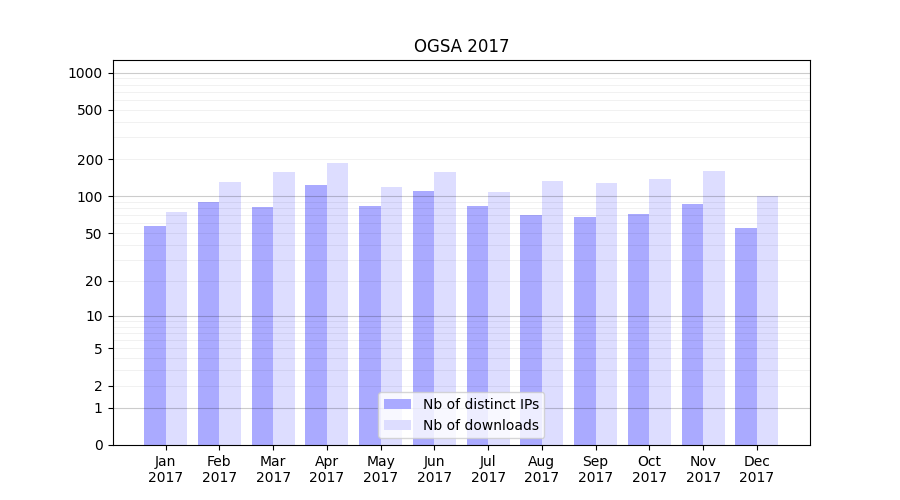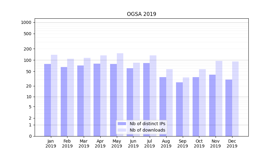 Number of downloads for software package OGSA, year by year, from 2025 back to 2014 (years with no downloads are omitted):