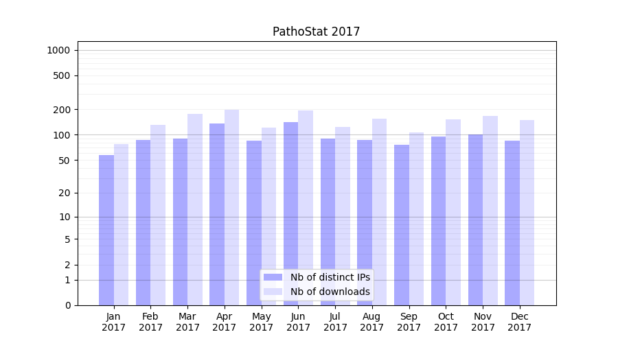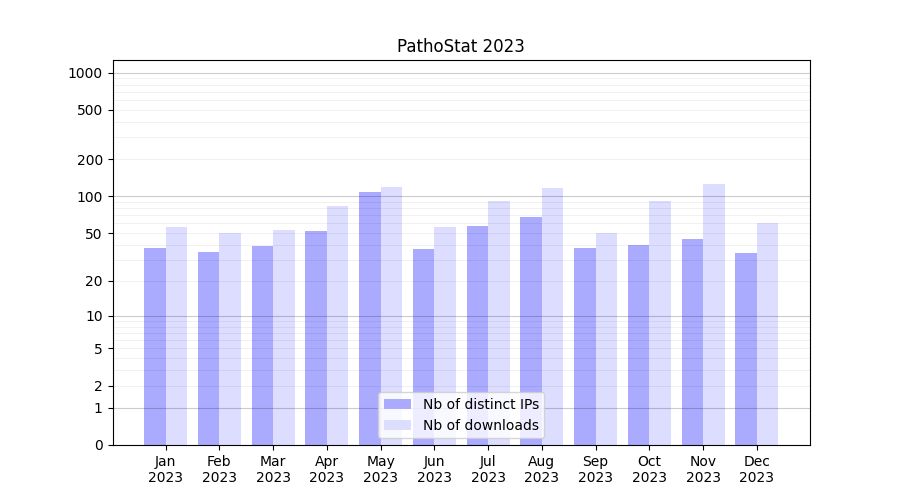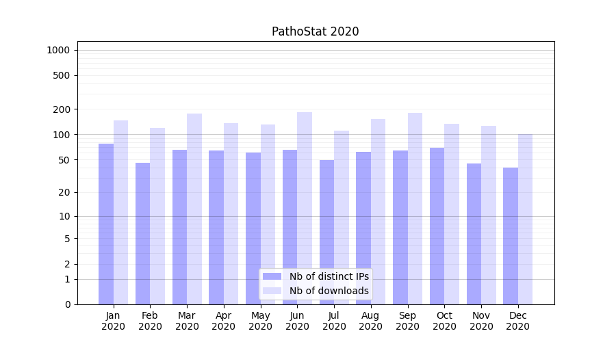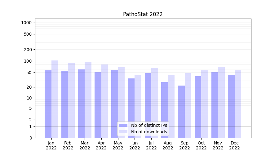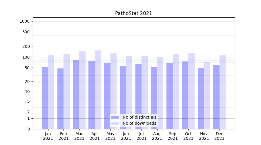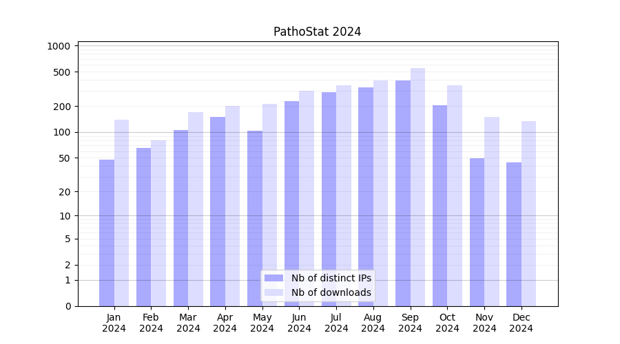 Number of downloads for software package PathoStat, year by year, from 2025 back to 2014 (years with no downloads are omitted):
