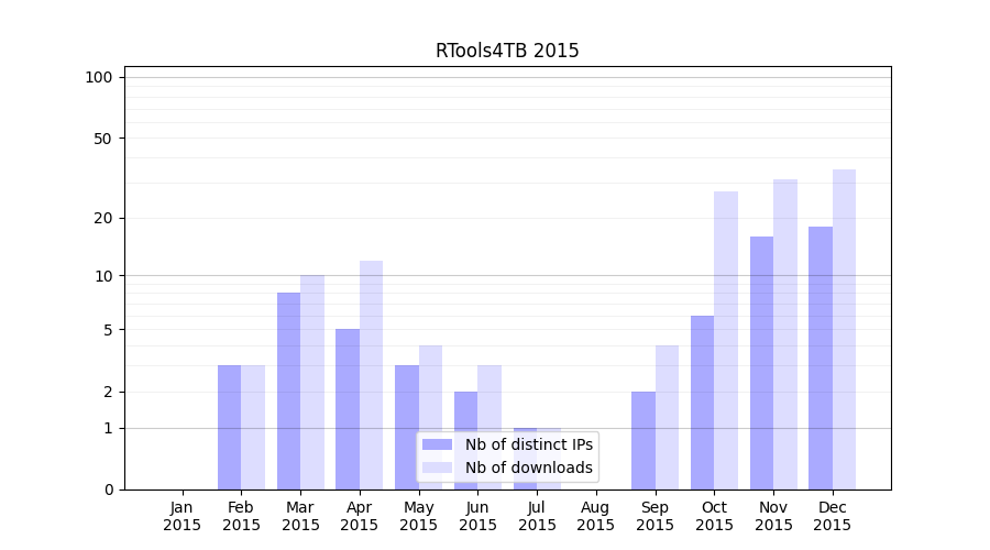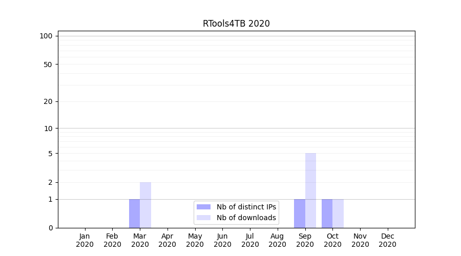 Number of downloads for software package RTools4TB, year by year, from 2025 back to 2014 (years with no downloads are omitted):
