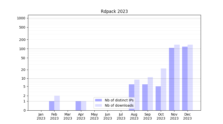 Number of downloads for software package Rdpack, year by year, from 2025 back to 2014 (years with no downloads are omitted):