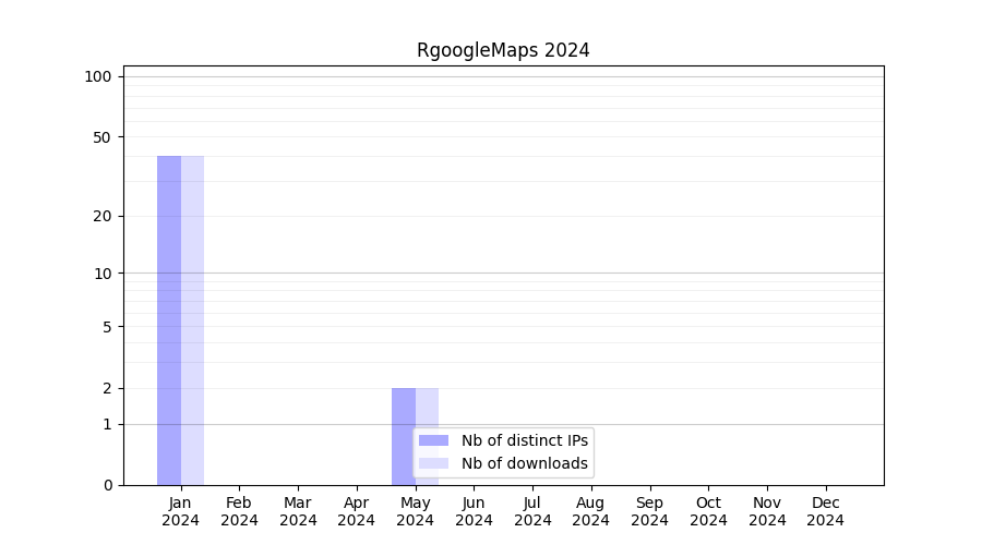 Number of downloads for software package RgoogleMaps, year by year, from 2025 back to 2014 (years with no downloads are omitted):