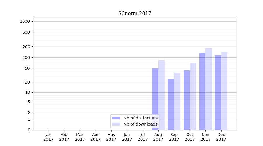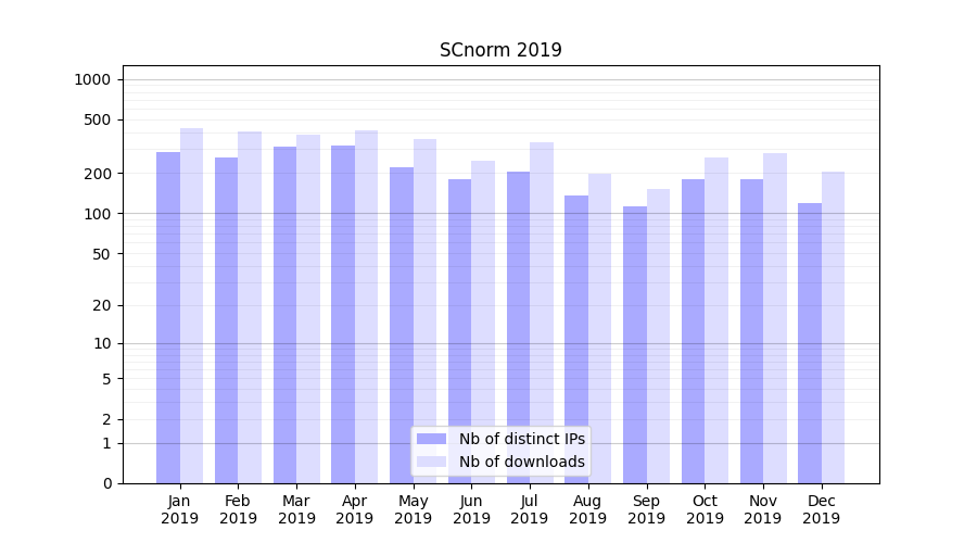 Number of downloads for software package SCnorm, year by year, from 2025 back to 2014 (years with no downloads are omitted):
