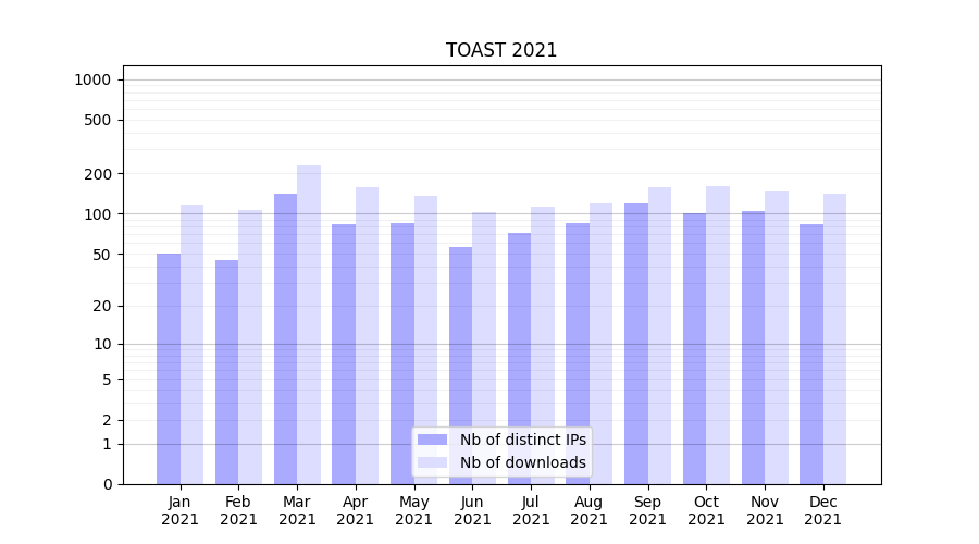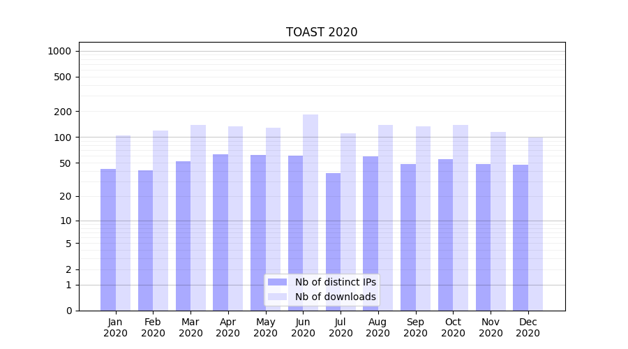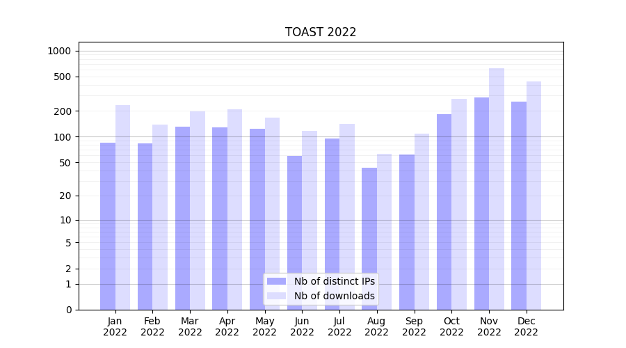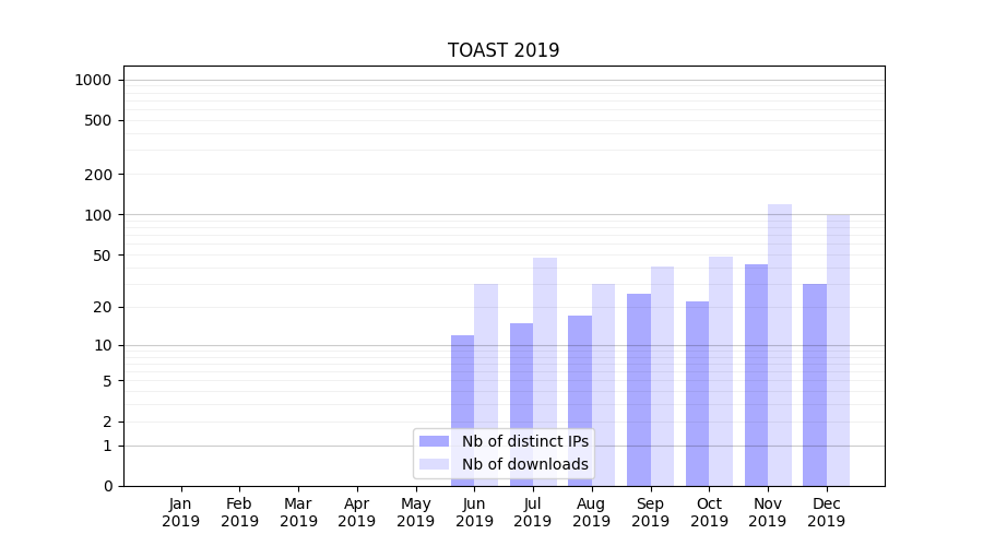 Number of downloads for software package TOAST, year by year, from 2025 back to 2014 (years with no downloads are omitted):