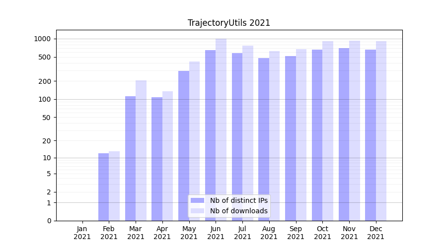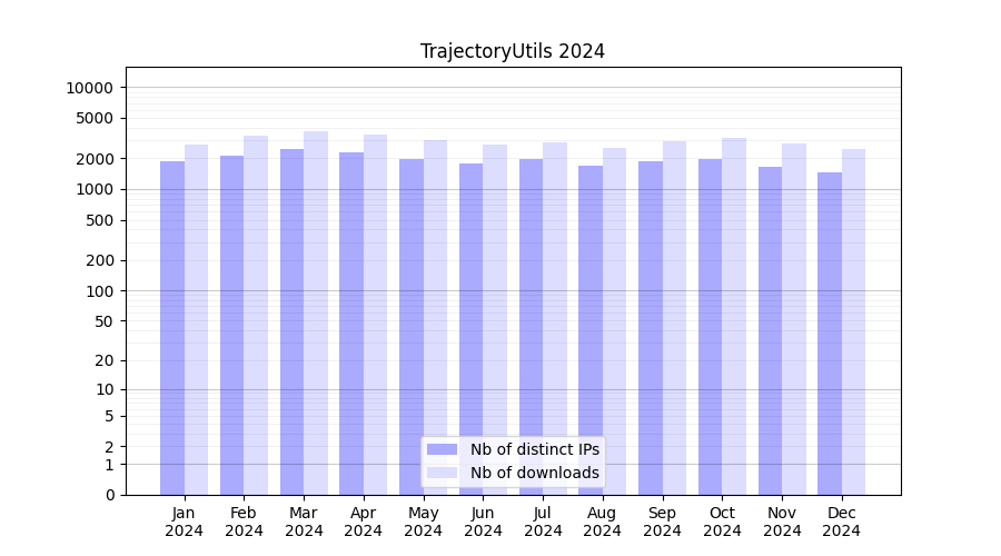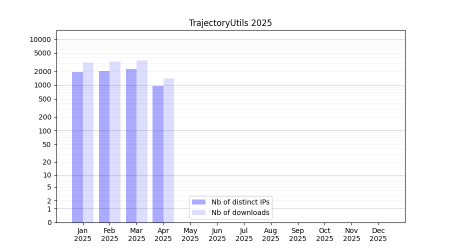 Number of downloads for software package TrajectoryUtils, year by year, from 2025 back to 2014 (years with no downloads are omitted):