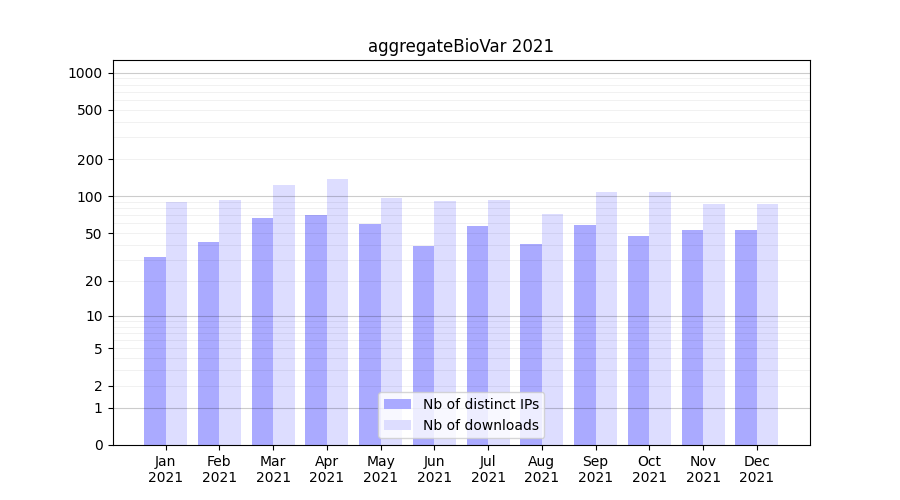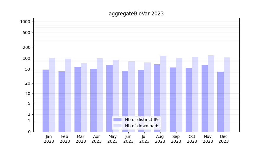 Number of downloads for software package aggregateBioVar, year by year, from 2025 back to 2014 (years with no downloads are omitted):