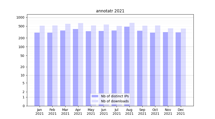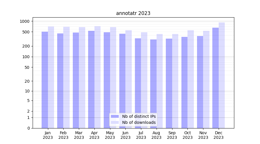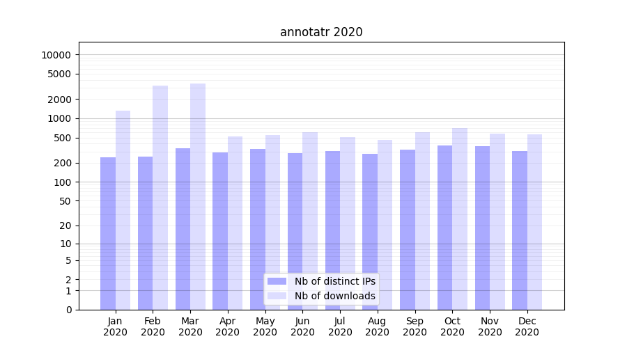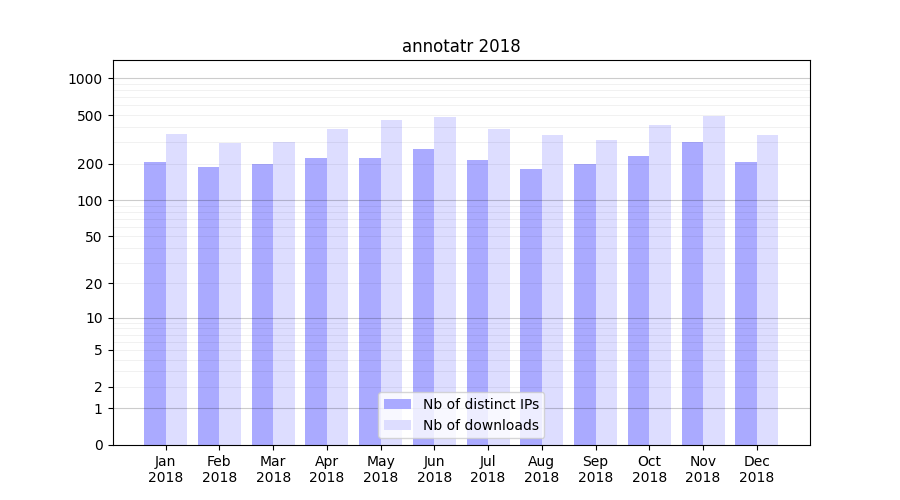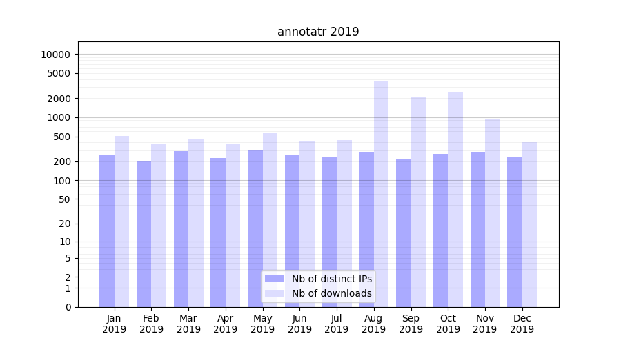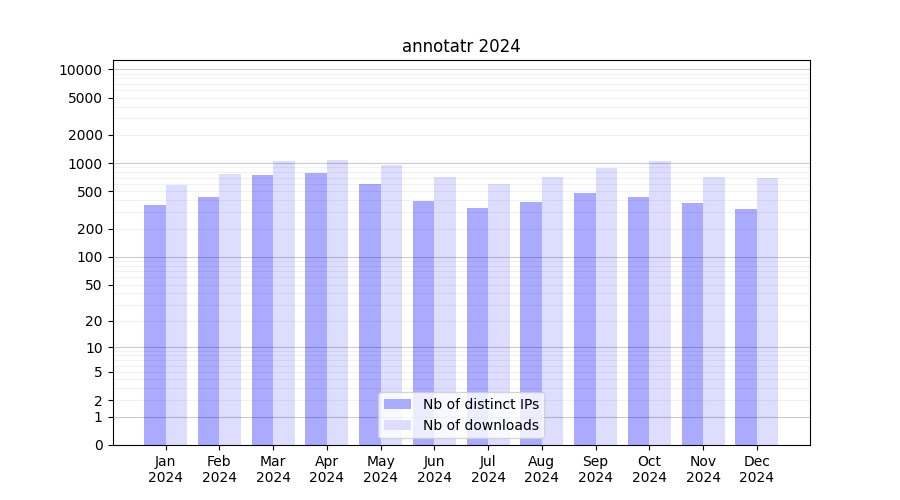 Number of downloads for software package annotatr, year by year, from 2025 back to 2014 (years with no downloads are omitted):