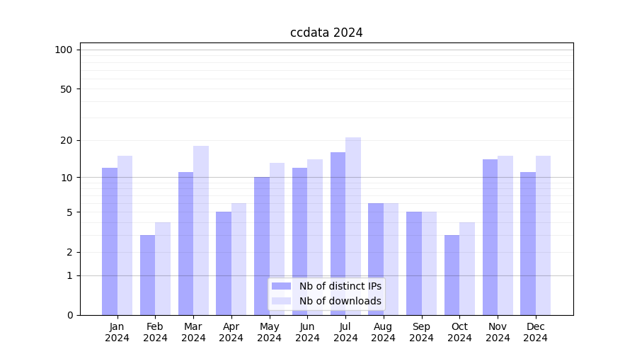 Number of downloads for software package ccdata, year by year, from 2025 back to 2014 (years with no downloads are omitted):