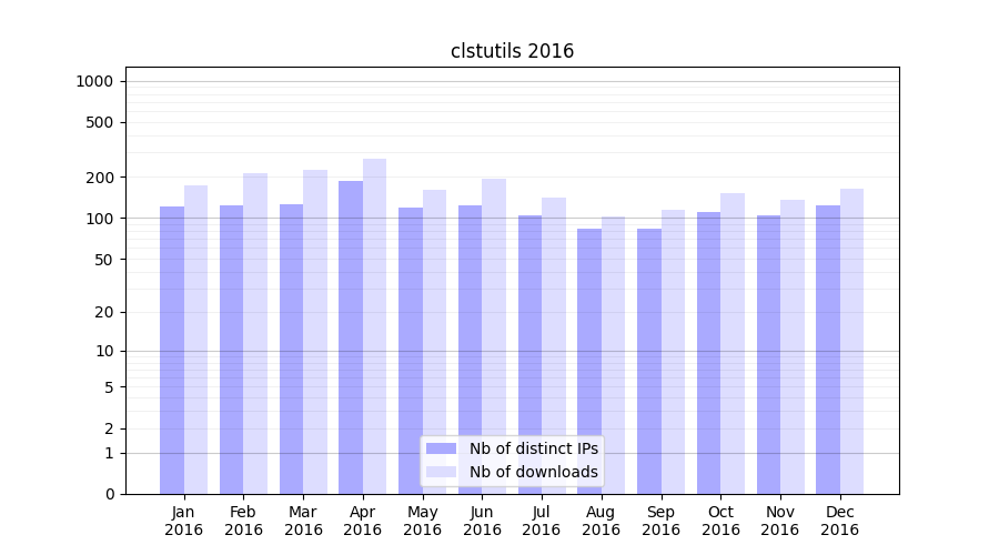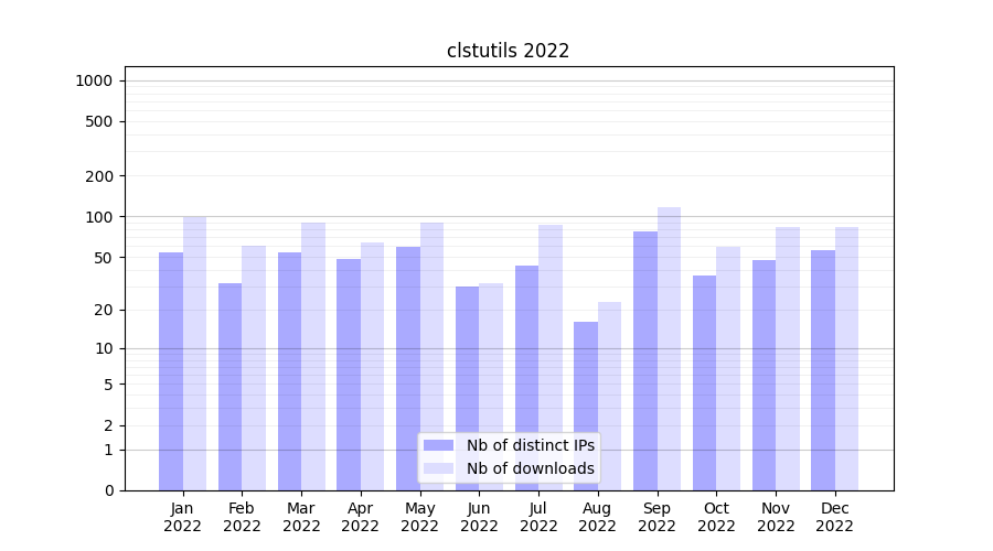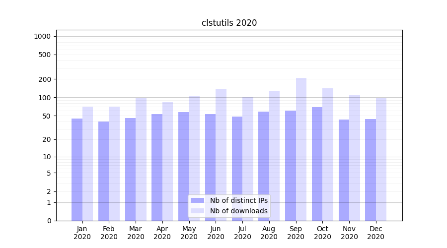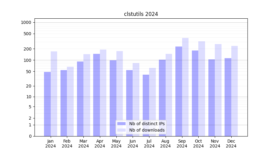 Number of downloads for software package clstutils, year by year, from 2025 back to 2014 (years with no downloads are omitted):