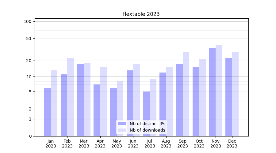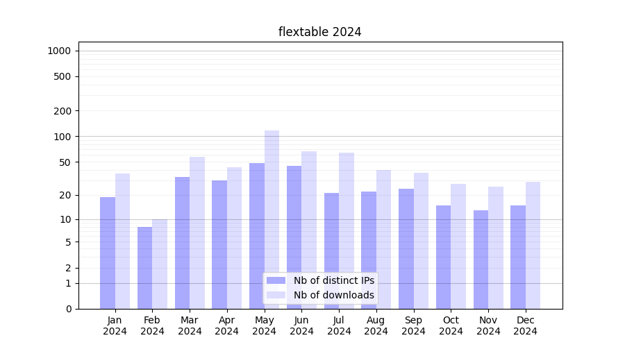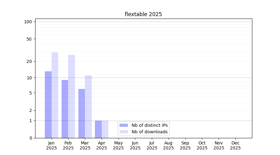 Number of downloads for software package flextable, year by year, from 2025 back to 2014 (years with no downloads are omitted):