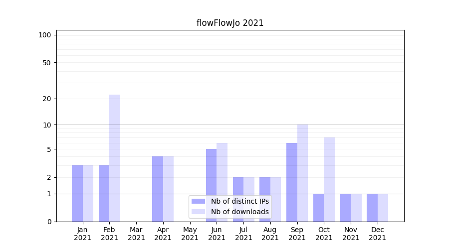 Number of downloads for software package flowFlowJo, year by year, from 2025 back to 2014 (years with no downloads are omitted):