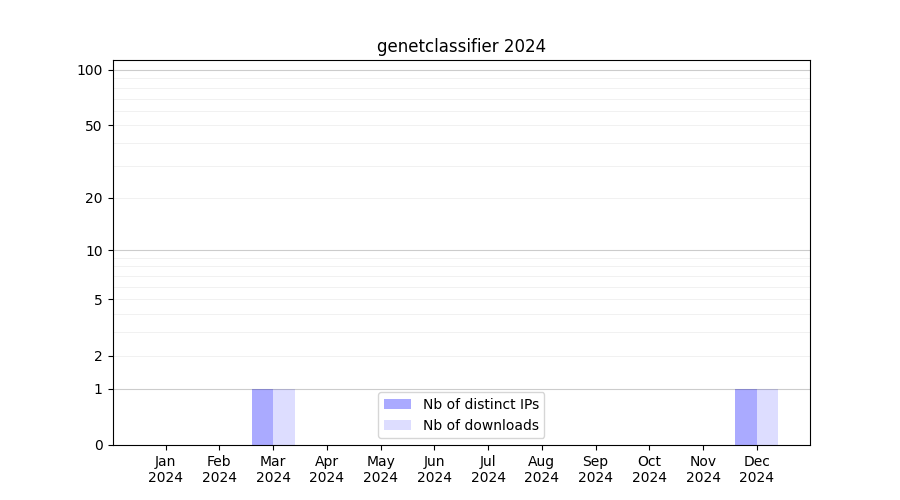 Number of downloads for software package genetclassifier, year by year, from 2025 back to 2014 (years with no downloads are omitted):