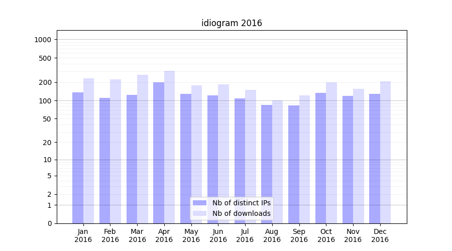 Number of downloads for software package idiogram, year by year, from 2025 back to 2014 (years with no downloads are omitted):