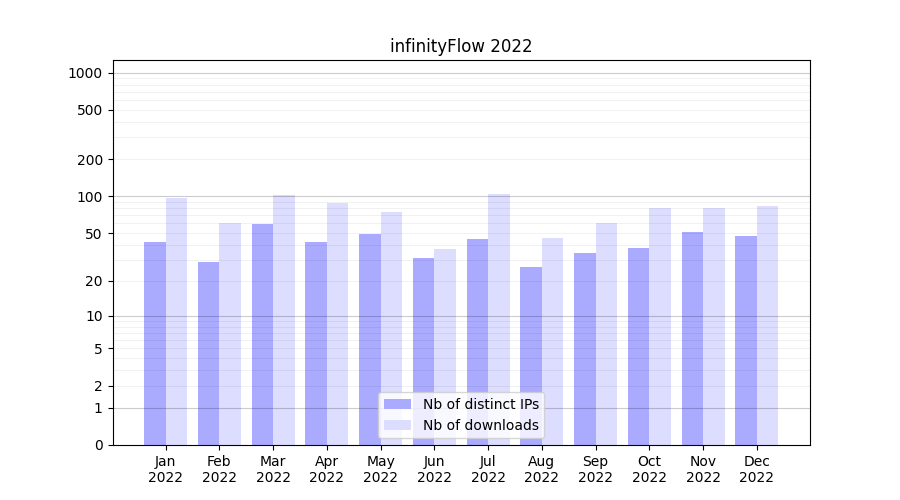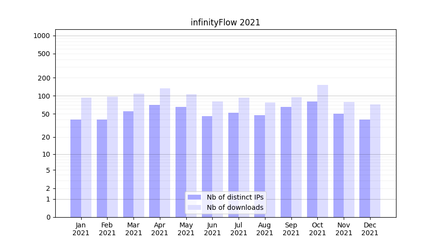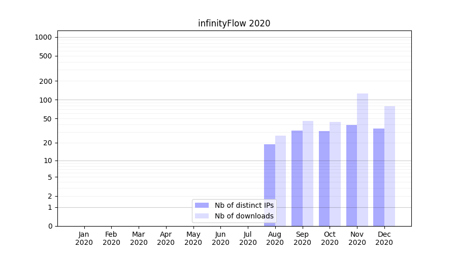 Number of downloads for software package infinityFlow, year by year, from 2025 back to 2014 (years with no downloads are omitted):